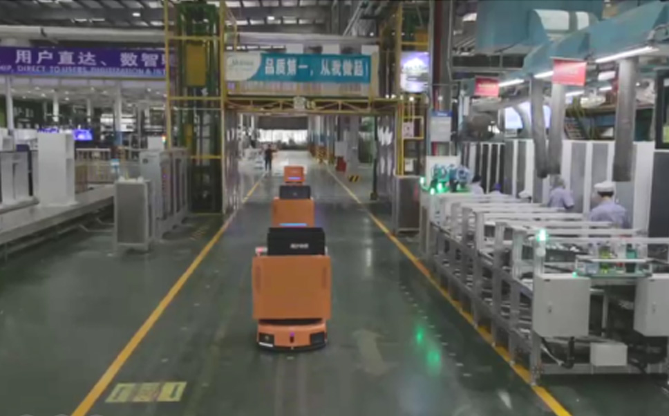 为车载冰箱物流配送打造的智能解决方案,包含产中物流通过潜伏举升AMR搬运至线边,产后成品物流智能仓储,流程包含产中物流智能齐套入库,线边安灯叫料AMR智能配送至线边,成品入库、出库,通过无人堆高车机器人,智能仓储管理替代人工作业管理,实现更高存储、更高效率、更具柔性化的解决方案。